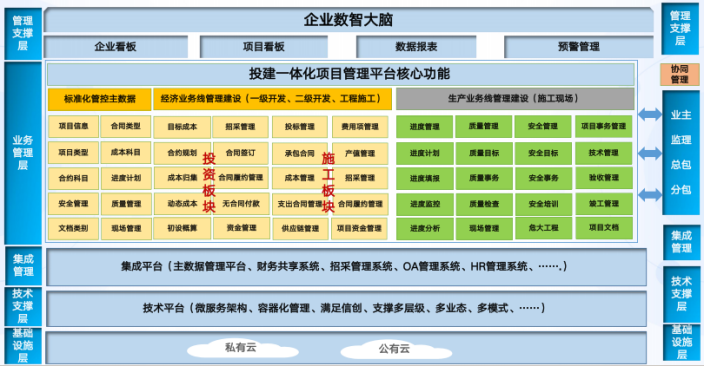 以“統(tǒng)建+集成+節(jié)約”建設(shè)數(shù)智建管平臺(tái),既降低各出資公司自行建設(shè)系統(tǒng)與集團(tuán)統(tǒng)建系統(tǒng)互聯(lián)互通的成本,又通過(guò)統(tǒng)建統(tǒng)一平臺(tái)、統(tǒng)一標(biāo)準(zhǔn),有效實(shí)現(xiàn)了集團(tuán)建設(shè)項(xiàng)目的規(guī)范化、集中化、精細(xì)化、穿透化、智能化、數(shù)字化,助力進(jìn)度不延期,成本不超概,質(zhì)量守底線(xiàn),安全防紅線(xiàn)管理目標(biāo)的達(dá)成。