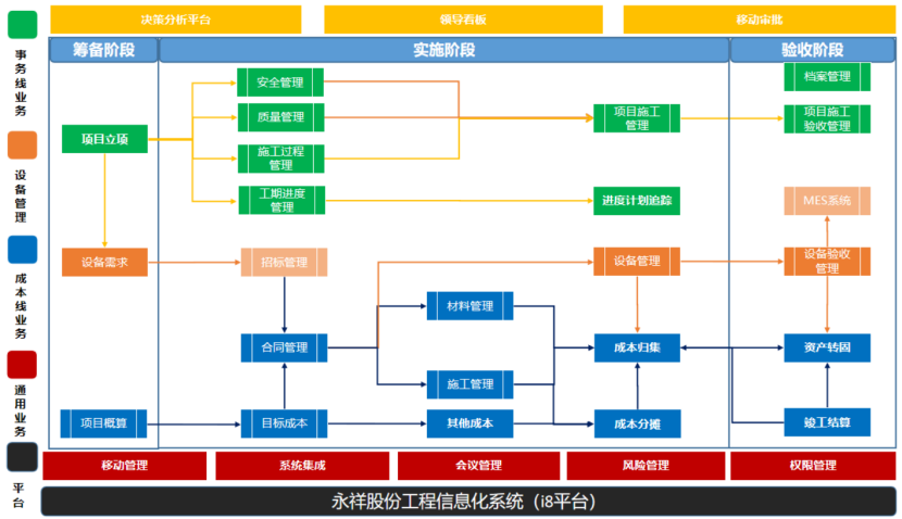 工程管理系統整合了物資管理、成本管理、設計管理、設備安裝管理、土建質量管理、安全管理、風險管理、會議管理、移動管理、檔案管理、進度計劃管理等所有相關的業務流程,涵蓋了項目全生命周期管理。項目藍圖方案如下圖: