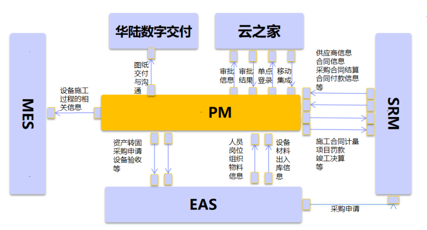 永祥股份工程項目管理系統作為源頭系統與EAS系統、MES系統、SRM系統、云之家等異構系統進行有效集成,將采購、結算、付款、審批等相關業務流、審批流信息系統打通。系統集成方案如下圖: