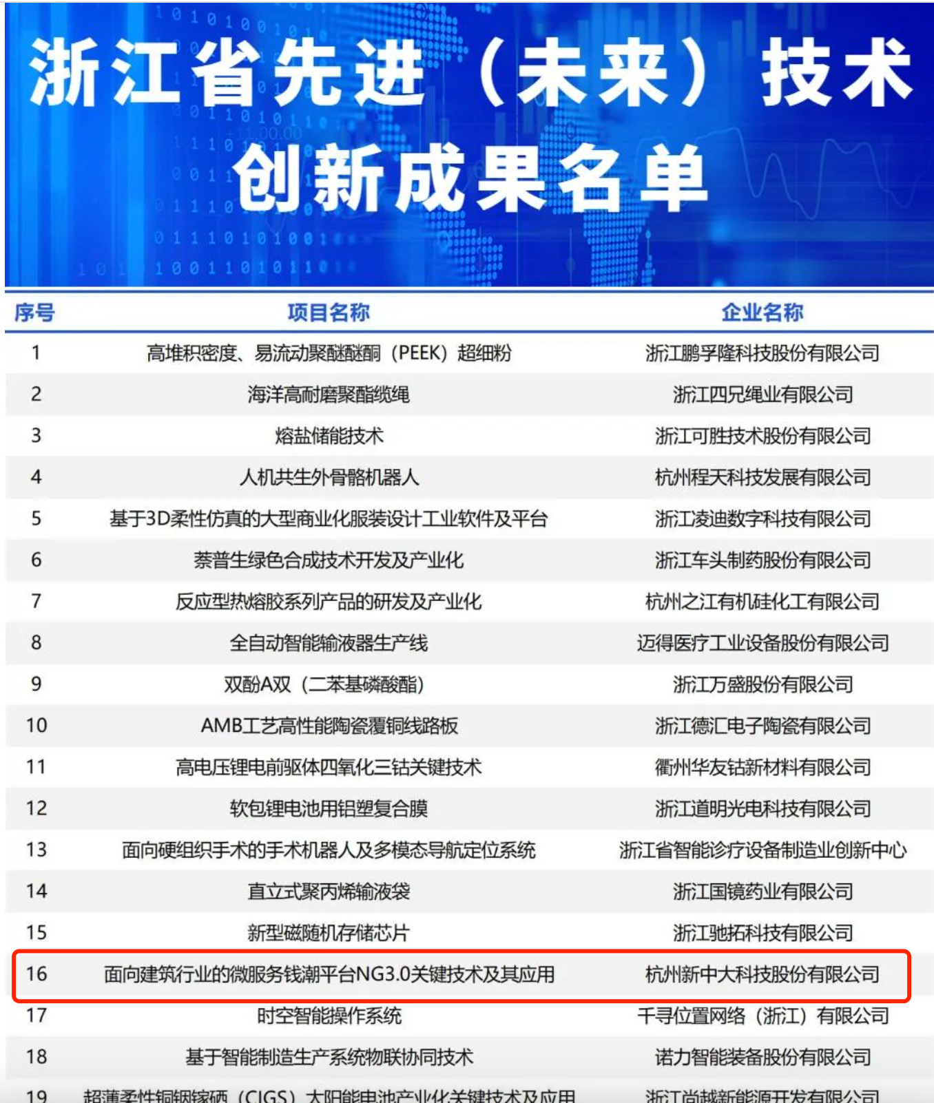 近日,浙江省經信廳公布了2023年浙江省先進(未來)技術創新成果名單,新中大科技“面向建筑行業的微服務錢潮平臺NG3.0關鍵技術及應用”(以下簡稱錢潮平臺)成功入選。據悉,本次浙江省先進(未來)技術創新成果征集活動由浙江省經濟和信息化廳發起,旨在深入實施創新驅動發展戰略,提高技術創新成果轉化和產業化水平,征集活動經申報推薦、專家評審、網上公示等環節,共認定2023年浙江省先進(未來)技術創新成果104項。
