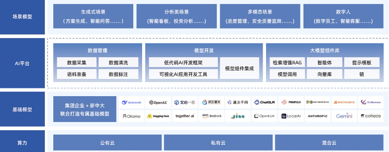 大型工程建設(shè)企業(yè)的項(xiàng)目管理場(chǎng)景具有高復(fù)雜性、強(qiáng)合規(guī)性和多層級(jí)協(xié)同需求,尤其是在企業(yè)日常業(yè)務(wù)管理過(guò)程中,“人財(cái)物產(chǎn)供銷(xiāo)”各環(huán)節(jié)的高效協(xié)同與精準(zhǔn)決策至關(guān)重要。新中大六和AI智能平臺(tái)通過(guò)集成主流大模型,形成具有新中大特色的行業(yè)大模型,深度應(yīng)用到項(xiàng)目進(jìn)度預(yù)測(cè)、成本測(cè)算、投標(biāo)管理、合同風(fēng)險(xiǎn)等多樣化應(yīng)用場(chǎng)景,通過(guò)語(yǔ)音文字識(shí)別、多輪對(duì)話(huà)、文檔分析等技術(shù)手段實(shí)現(xiàn)賦能企業(yè)管理,自動(dòng)化處理大量業(yè)務(wù)數(shù)據(jù),并提供精確的預(yù)測(cè)分析和智能決策支持。