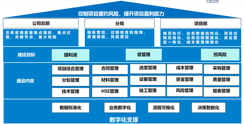 與此同時, 中國水電四局所屬上級集團中國電建集團數字化建設步伐也不斷加快,以PRP、財務共享、集采平臺、云供應鏈平臺、固定資產系統、大型機械等為核心的ERP生態系統要實現深度融合,同時市場對企業管理的要求越來越高,市場競爭日益激烈,而競爭機制的不夠完善造成了企業為了拿到一項工程施工任務,不得不在投標過程中采取“壓價”“低利”,甚至“無利”的方式參加競標,致使招投標工程價格偏低,企業經濟效益下滑,甚至嚴重危及企業的生存和發展,如何適應外部環境變化來調整自己的營銷策略,如何進一步以建設優質工程、提供優良服務,以極具競爭力的價格獲得訂單已迫在眉睫。在強手如林的競爭對手面前,價格競爭的優勢是企業獲取工程建設項目的關鍵,這就迫使經營者把加強成本核算體系和工程管控體系的建設放在重要的位置。公司對內部的精細化、規范化、信息化管理的需求日趨強烈,整合公司資源,提升公司的核心競爭力,重新構建一套適應和促進公司發展需要的項目管理數字化系統已經迫在眉睫。