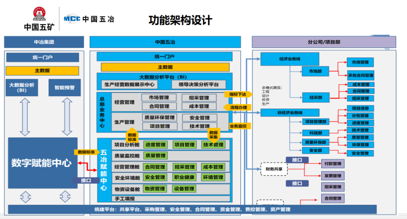 兩大賦能:包括中冶數字賦能總中心和五冶數字賦能分中心兩個部分,數字賦能所需的各項數據可通過五冶工程項目管控平臺自動采集,數據來源主要為“工程項目管理業務系統”、“財務共享系統”、“人力資源系統”等。